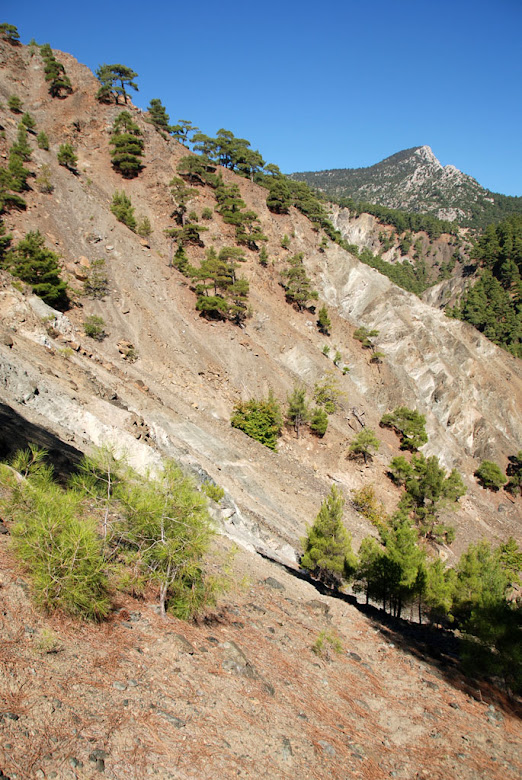 Nedenfor Sarıçinar Dağı sine fjellsider kommer jeg raskt til et felt med forkullede trær og rester av trær etter en brann. Ny underskog er på vei til å dannes og har allerede kommet et stykke på vei, så det må være en stund siden skogbrannen. Stien forsvinner innimellom i den nye vegetasjonen, men ikke så mye at et raskt overblikk fort gir svar på hvor ruten går videre. Spisse fjell ligger nord for ruten. Så bærer det oppover på en tøff og steinete sti.