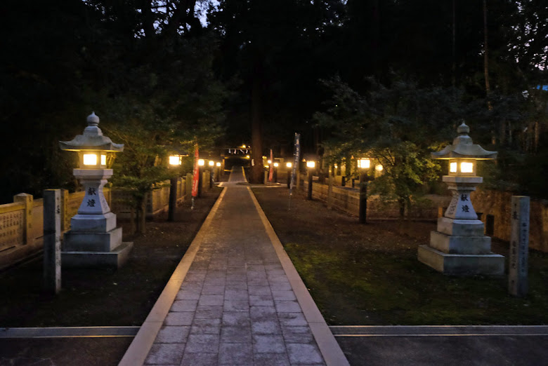Med lanternene og lampene lysende opp i skumringen er det et atmosfærisk besøk til den store helligdommen. Dekket av trær, er det en allé av bønnesteiner som er vagt illuminert av lanternene som leder meg inn til hjertet av helligdommen, og tar meg opp til bygningene som ligger på en terrasse med utsikt over området. En liten grupp av andre besøkende står utenfor hovedbygningen til helligdommen og messer i sammlet flokk. Jeg blir stående stille en liten stund og lyttende til messingen deres, så forlater jeg helligdommen samme vei som jeg kom og går ned til togstasjonen. Som heter Ishizuchiyama, passende nok.