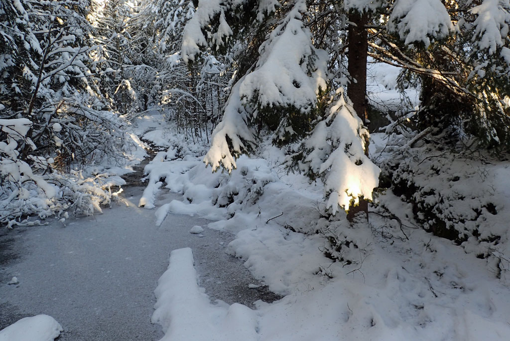 Gode sko er godt å ha, for etter en en stund med å løfte beina opp og ned i snøen begynner buksene å bli våte. Stien kaster meg ut på skogsbilveien fra Trehørningen mot Store Gørja. Bare et dypt og bredt spor fører nedover mot vannet. Ved Gørjahytta møter jeg på vertene som har tatt turen opp for å gjøre klar for vinterens innhogg av vaffelglade skiløpere. Men de hadde fått problemer med bilen, så mesteparten av tiden hadde gått bort til å fikse den.